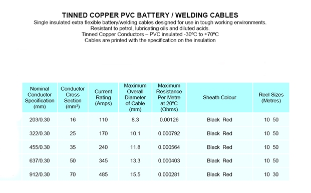 Dieses Batteriekabel entspricht einem flexiblen Batteriekabel, nur dass die Kupferleiter verzinnt sind, wodurch sie für eine Anwendung in marinen und anderen korrosiven Umgebungen besser geeignet sind. Die Kabeldaten finden Sie in den nachstehenden blauen Kästen. Bspw. besitzt das 011001 203 Litzen aus verzinnten Kupferdraht von 0,3 mm Durchmesser (203/0.3), einen Leiterquerschnitt von 16 mm², eine Kapazität von 110 Ampere und sein Durchmesser inkl. Isolierung beträgt 8,3 mm. Für die vollständigen Kabeldaten klicken Sie bitte auf den nachstehenden Link.